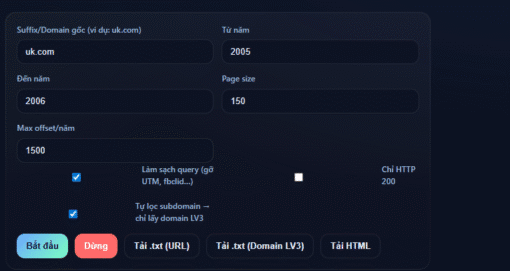 Công cụ tự code tìm domain cổ trên https://archive.org/, công cụ này giúp tìm domain có lịch sử, quét các đuôi domain .uk.com, .sa.com, .ru.com, .in.net, .it.com, .eu.com, .us.com,…